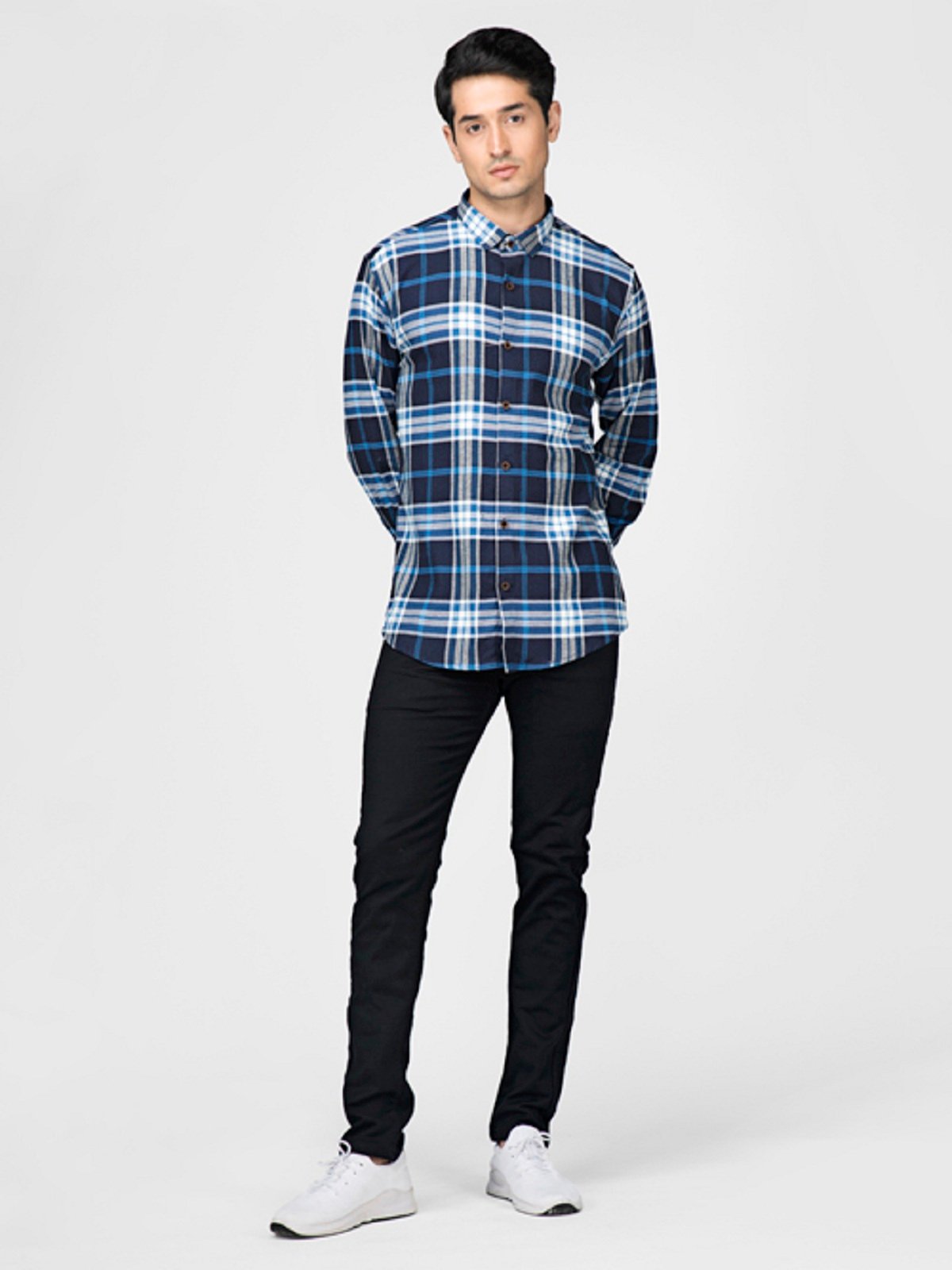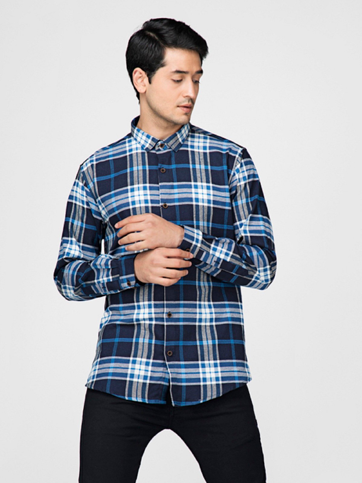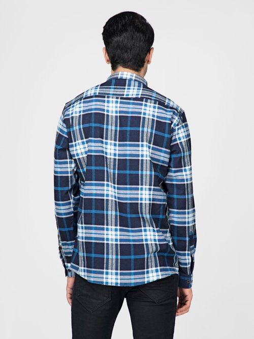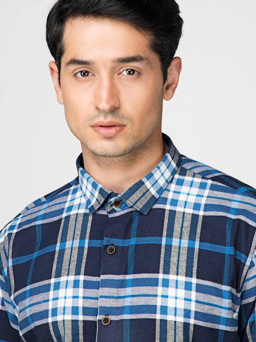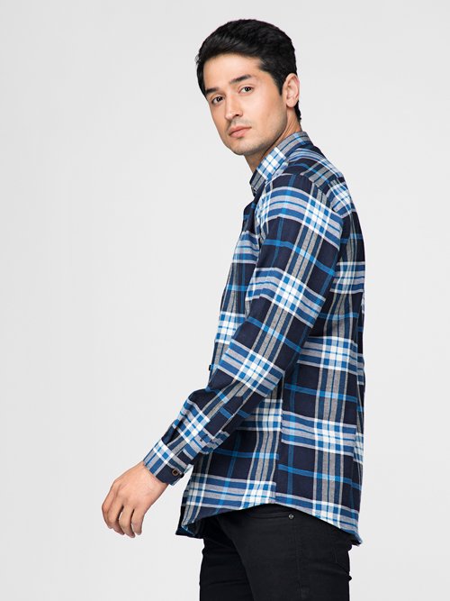 BLUE BIG CHECKS casual shirt Has a button-down collar, Long sleeves with roll-up button tabs, curved hemline.
