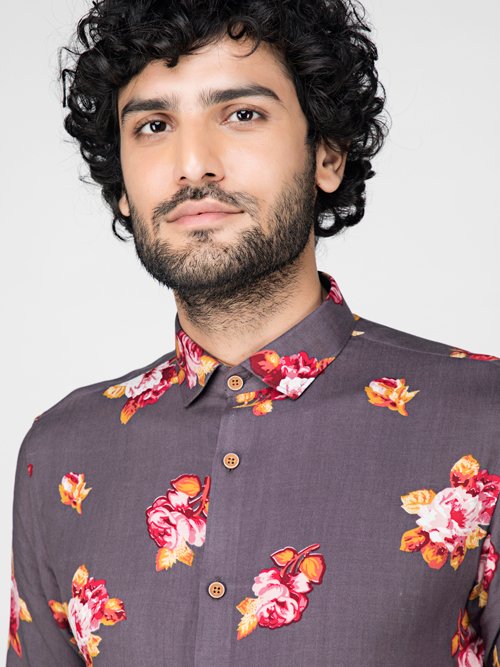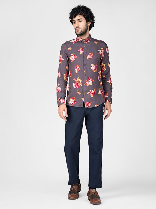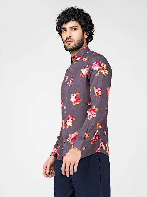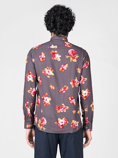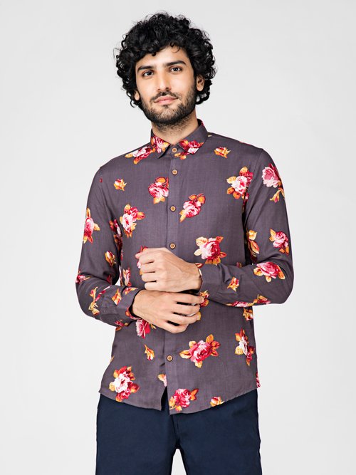 GREY FLORAL PRINT CASUAL SHIRT WITH FULL SLEEVES.