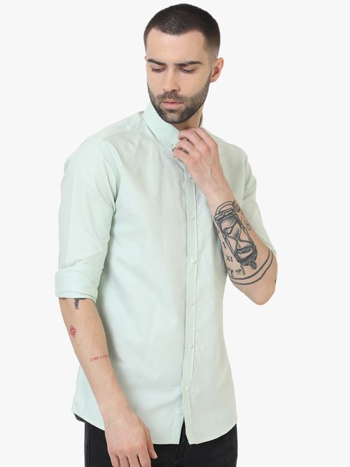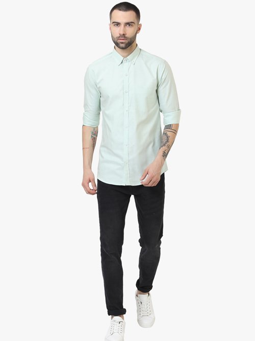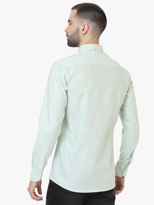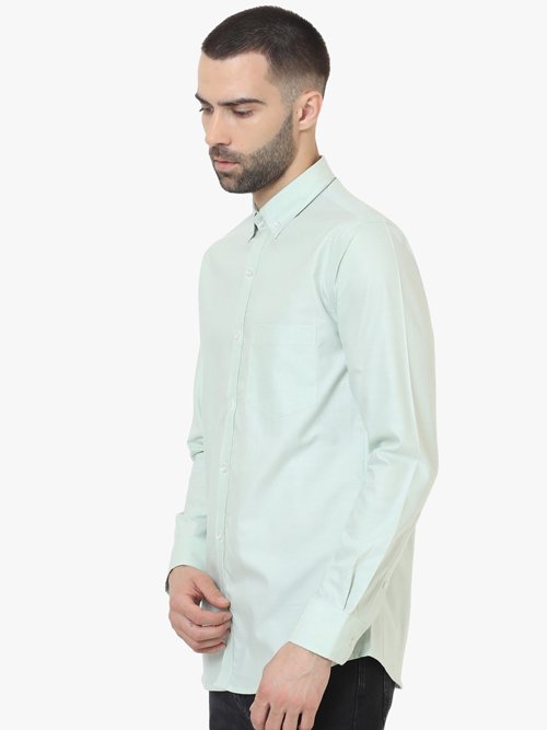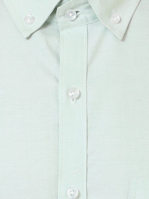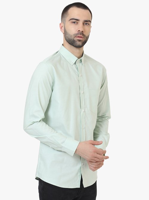 SEA GREEN OXFORD SOLID casual shirt Has a button-down collar A full button placket A solid style Long sleeves with roll-up button tabs A curved hemline.