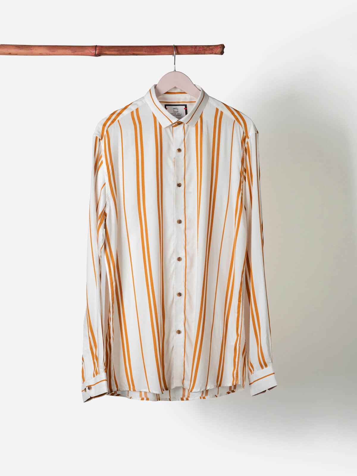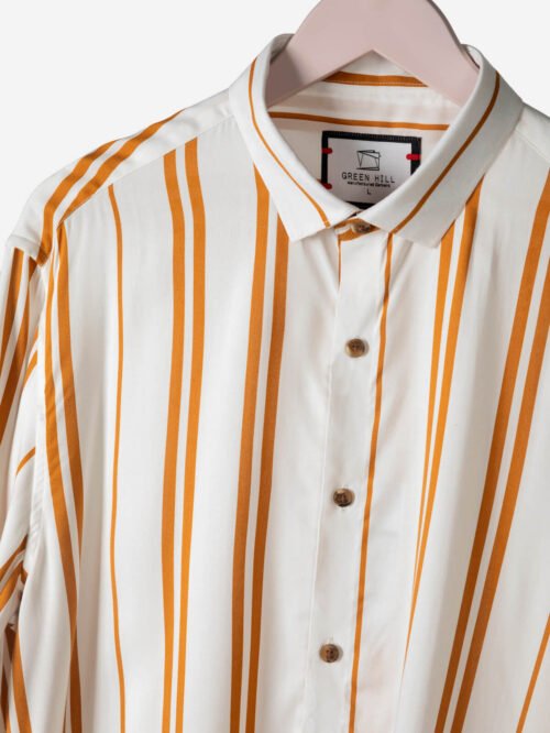 REGULAR FIT COLLARED ORANGE STRIPE SHIRT WITH FULL SLEEVES AND A BACK CUT COLLAR.